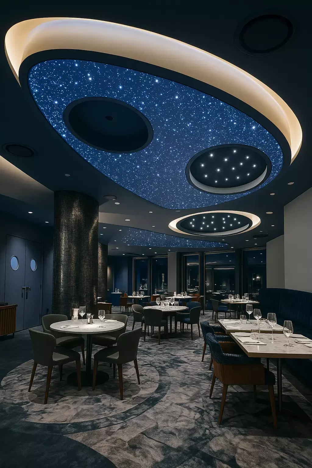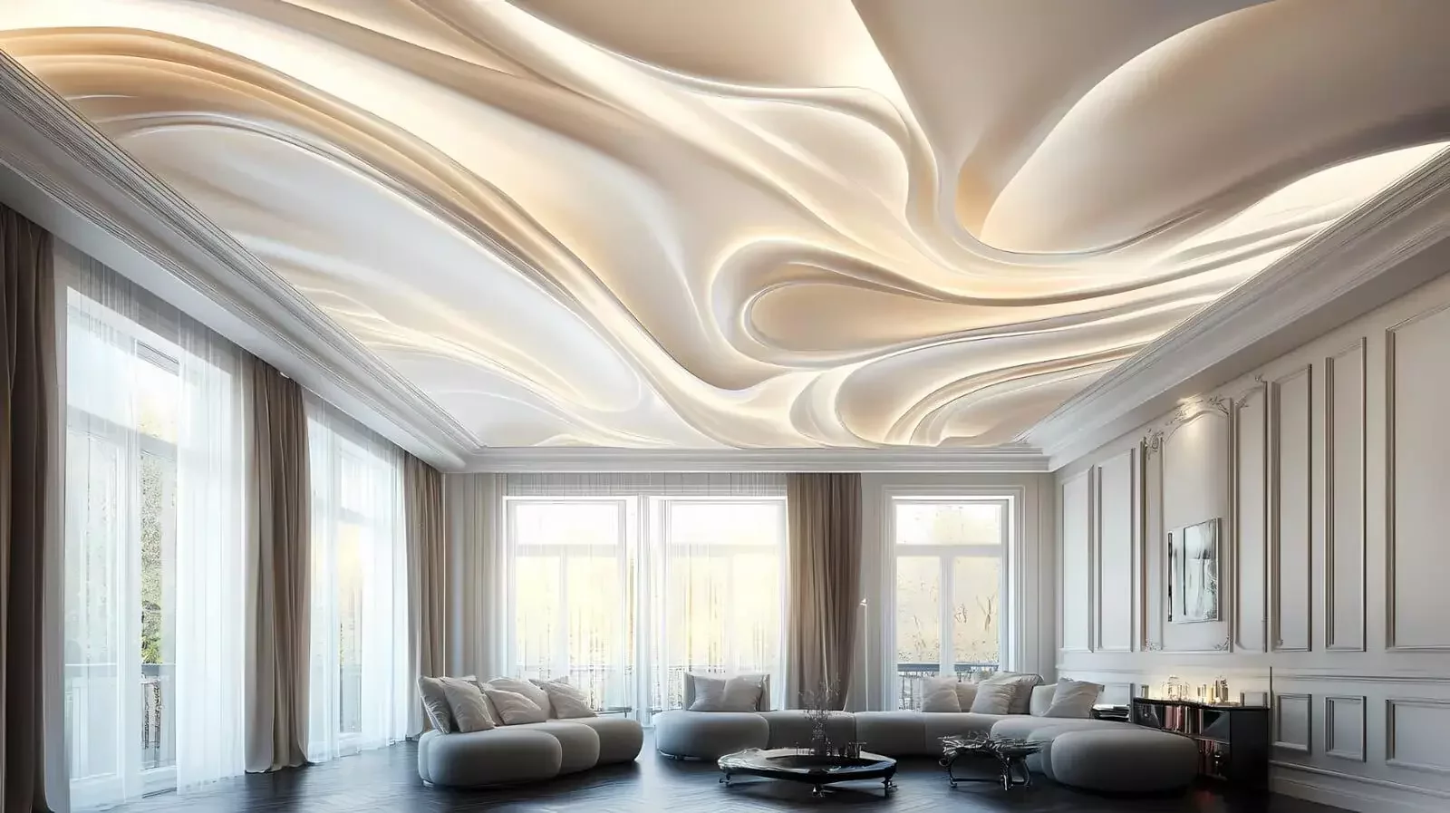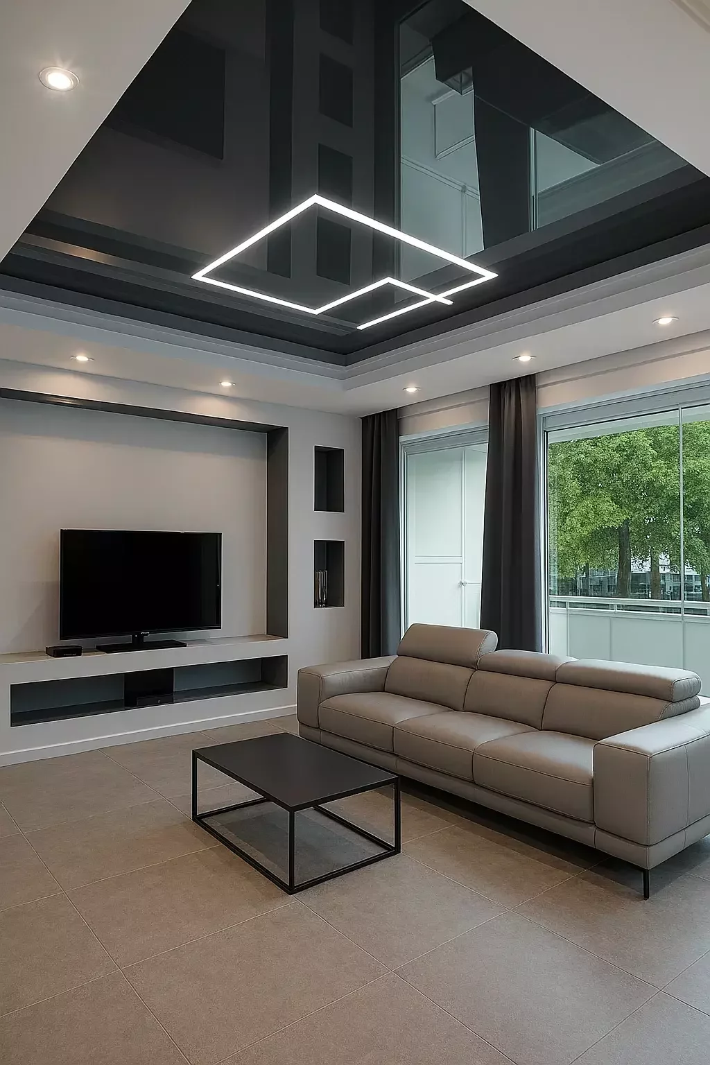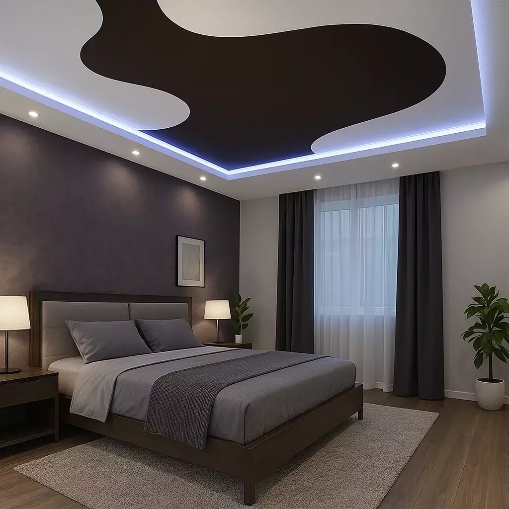 A stretch ceiling is a suspended system involving a perimeter track and a lightweight fabric membrane that stretches across the existing ceiling and clips into the track.This versatile solution can conceal imperfections and integrate all types of lighting fixtures, grilles, and fixing points, enhancing both aesthetics and functionality.