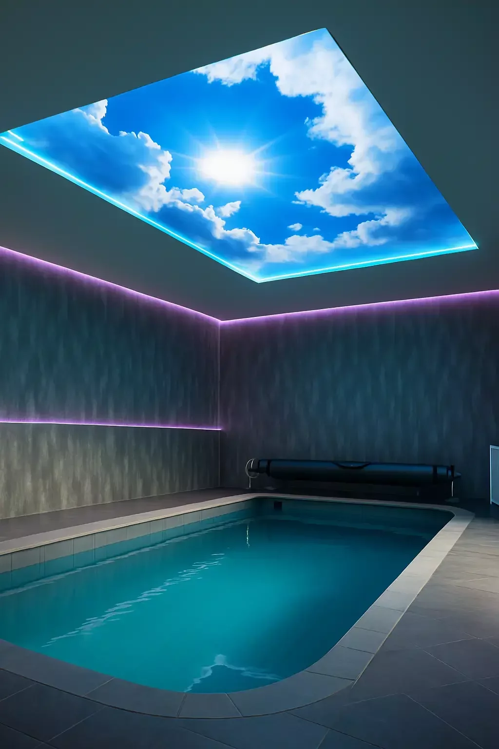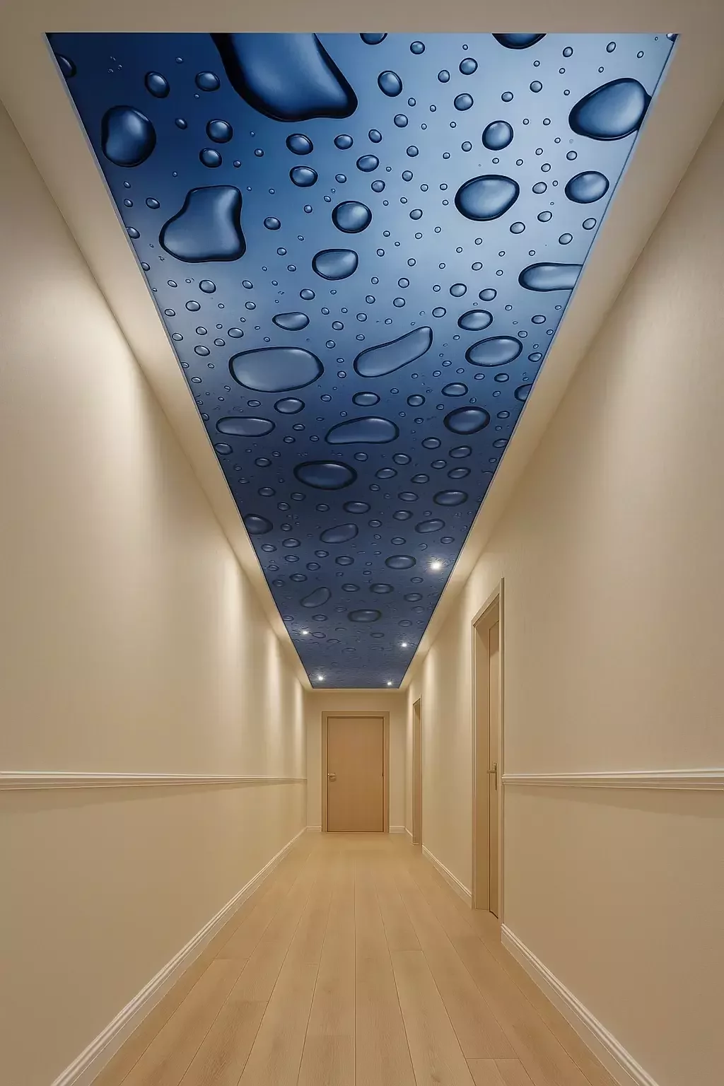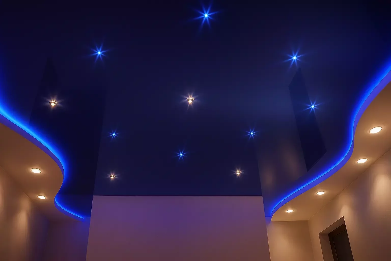 A stretch ceiling is a suspended system involving a perimeter track and a lightweight fabric membrane that stretches across the existing ceiling and clips into the track.This versatile solution can conceal imperfections and integrate all types of lighting fixtures, grilles, and fixing points, enhancing both aesthetics and functionality.